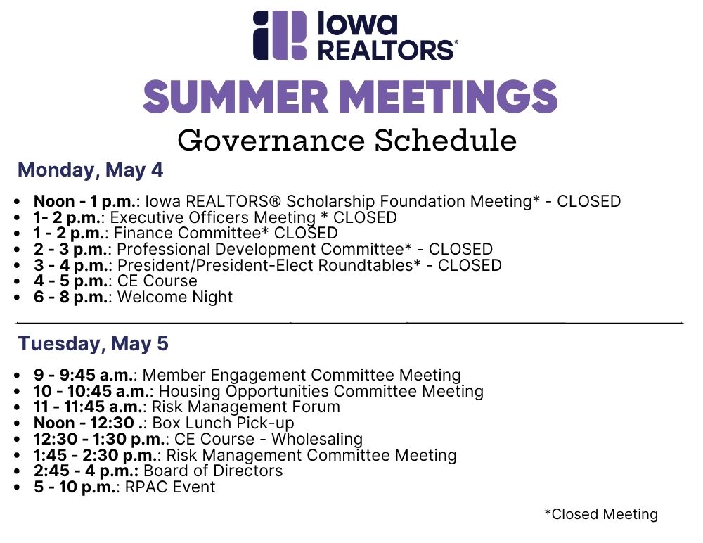 04 May Summer Meetings 2026 Summer Meetings 2026 Monday, May 4, 2026 (8:00 AM) to Tuesday, May 5, 2026 (4:00 PM) Hyatt Regency Coralville Hotel and Conference Center Details You're Registered! DescriptionLocationSchedule Join us for the 2026 Summer Meetings in Coralville! Over two enriching days, join fellow real estate professionals for networking opportunities and engaging discussions. Together, we'll chart the course to propel the Iowa REALTORS® into a future of innovation and success. Don't miss out on this exceptional event! Click here to book your hotel room at the Hyatt Regency Coralville Hotel and Conference Center: https://www.hyatt.com/events/ en-US/group-booking/IOWRC/G- IAR7 Disclaimer: Meetings marked with an (*) are closed. Hyatt Regency Coralville Hotel and Conference Center 300 E 9th StreetCoralville, IA 52241 Map & Directions TitleWhen CE Course Begins 05.04.2026 (4:00PM) Ends 05.04.2026 (5:00PM) Welcome Night Begins 05.04.2026 (6:00PM) Ends 05.04.2026 (8:00PM) Box Lunch Pick-up Begins 05.05.2026 (12:00PM) Ends 05.05.2026 (12:30PM) The Whole(saling) Truth: Understanding the Process and Iowa Code Begins 05.05.2026 (12:30PM) Ends 05.05.2026 (1:30PM)